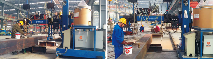 本機采用垂直電渣焊將內(nèi)隔板與周圍鋼板焊接牢固。有熔嘴式與熔絲式二種電渣焊可供客戶選擇。熔嘴式操作簡單,投資省,使用成本高;熔絲式操作復雜,投資大,使用成本低。